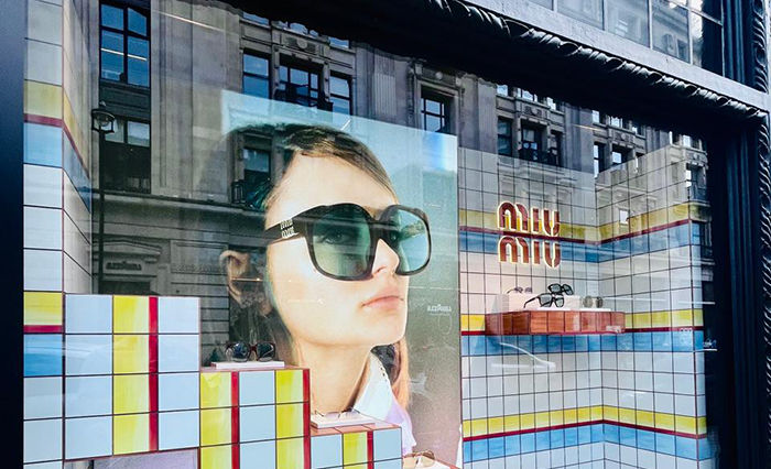 Miu Miu’s new eyewear collection, brought to life through bold, immersive visuals and the use of 3D Raised Ink Printing by Displayways to simulate an installation of ceramic tiles on the walls of the displays.